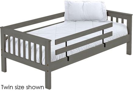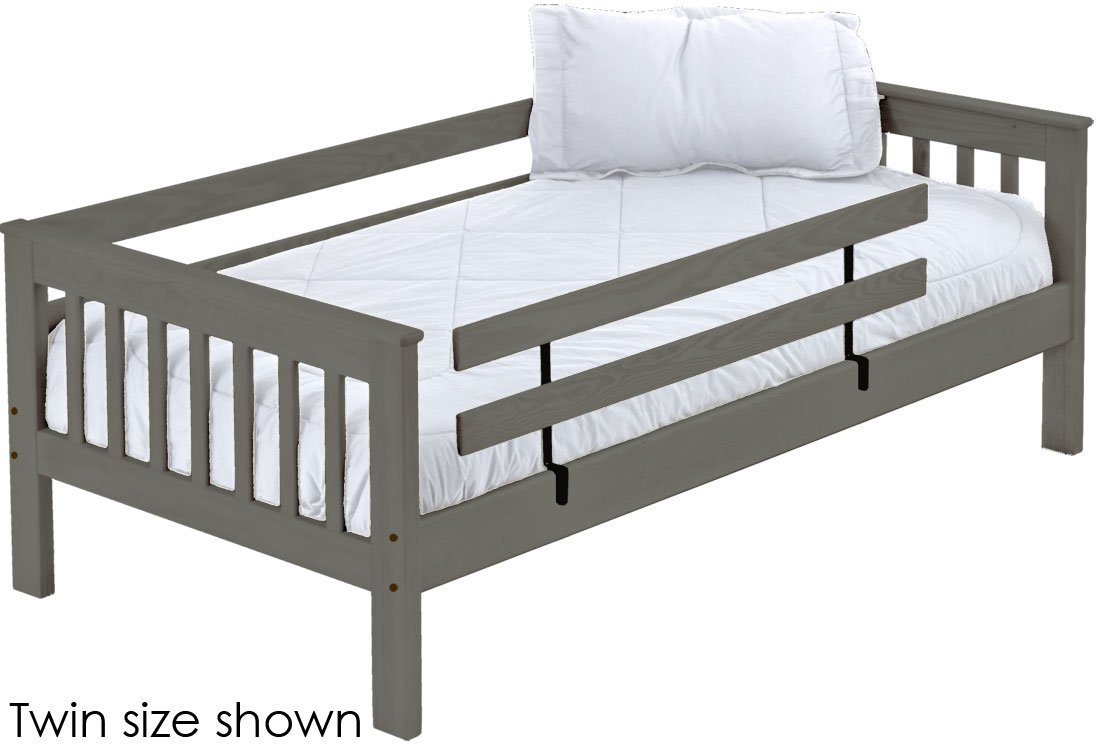 A full length rear guardrail and a removable front guardrail are included. Options include extra-long for big kids.
