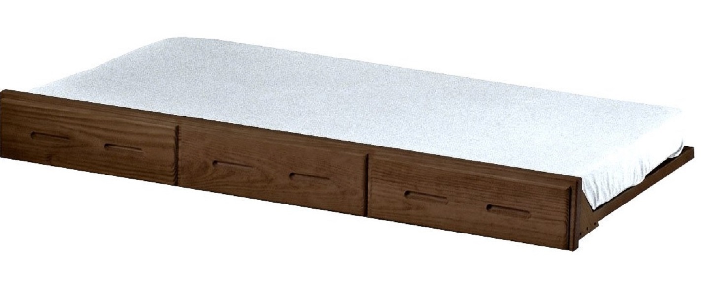 The trundle bed rolls out easily on 6 casters. You can use it under any CD bed as an extra hidden bed. Requires the Trundle Mattress. Regular mattresses will not fit.