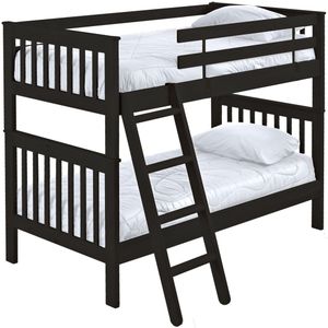Mission bunk beds include a removable ladder that can be used on the front or ends of the bed. A full length rear guardrail and a removable front guardrail are included. Options include extra-long for big kids and a taller version to allow 8” more headroom under the bed for comfortable seating. Add optional drawers or a trundle bed for maximum use of your floor space. Ready for a mattress, no foundation required. The top of an 8” thick mattress will be 21" off the floor on the lower bed and 57” off the floor on the upper bed.
