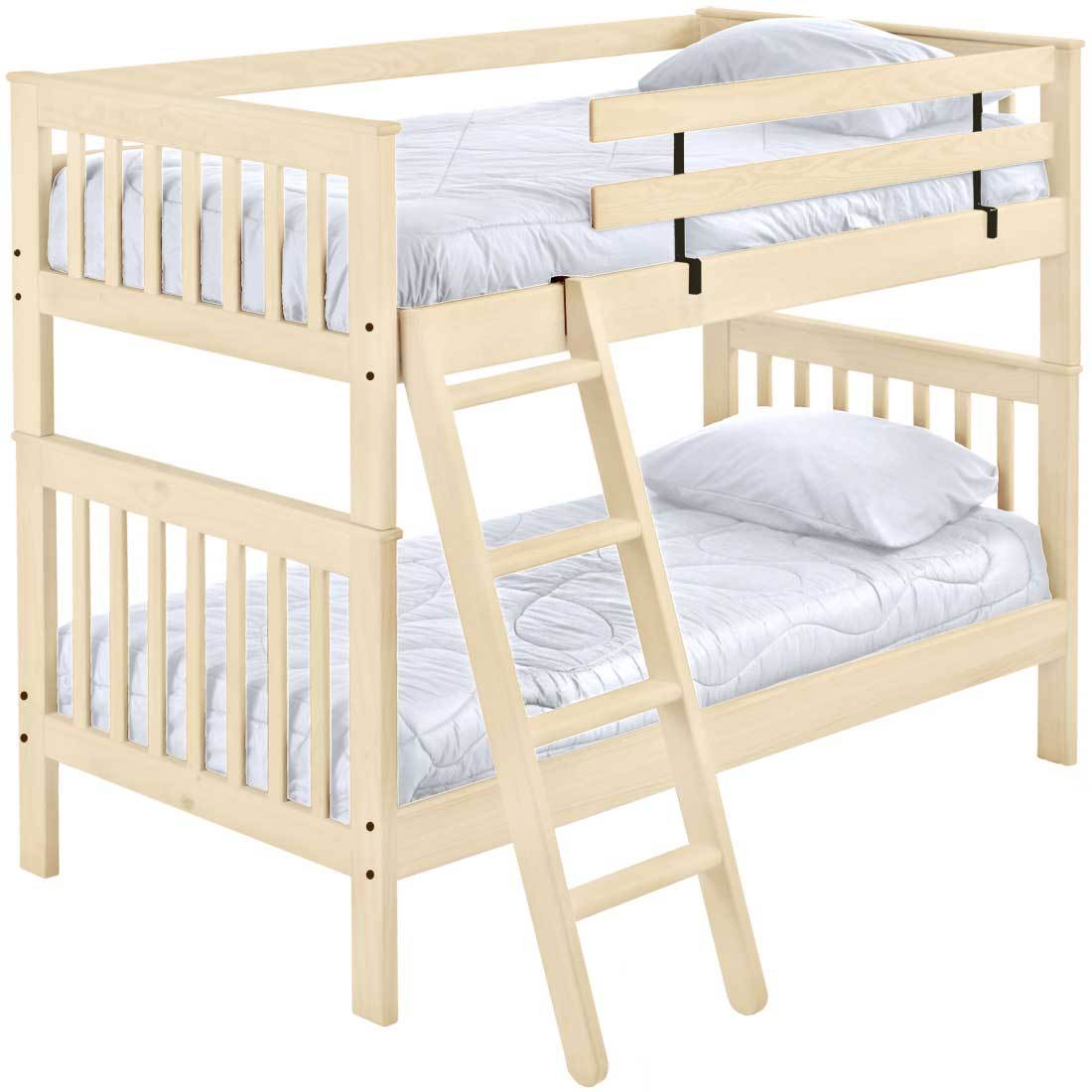 Mission bunk beds include a removable ladder that can be used on the front or ends of the bed. A full length rear guardrail and a removable front guardrail are included. Options include extra-long for big kids and a taller version to allow 8” more headroom under the bed for comfortable seating. Add optional drawers or a trundle bed for maximum use of your floor space. Ready for a mattress, no foundation required. The top of an 8” thick mattress will be 21" off the floor on the lower bed and 57” off the floor on the upper bed. (65” on Tall models).