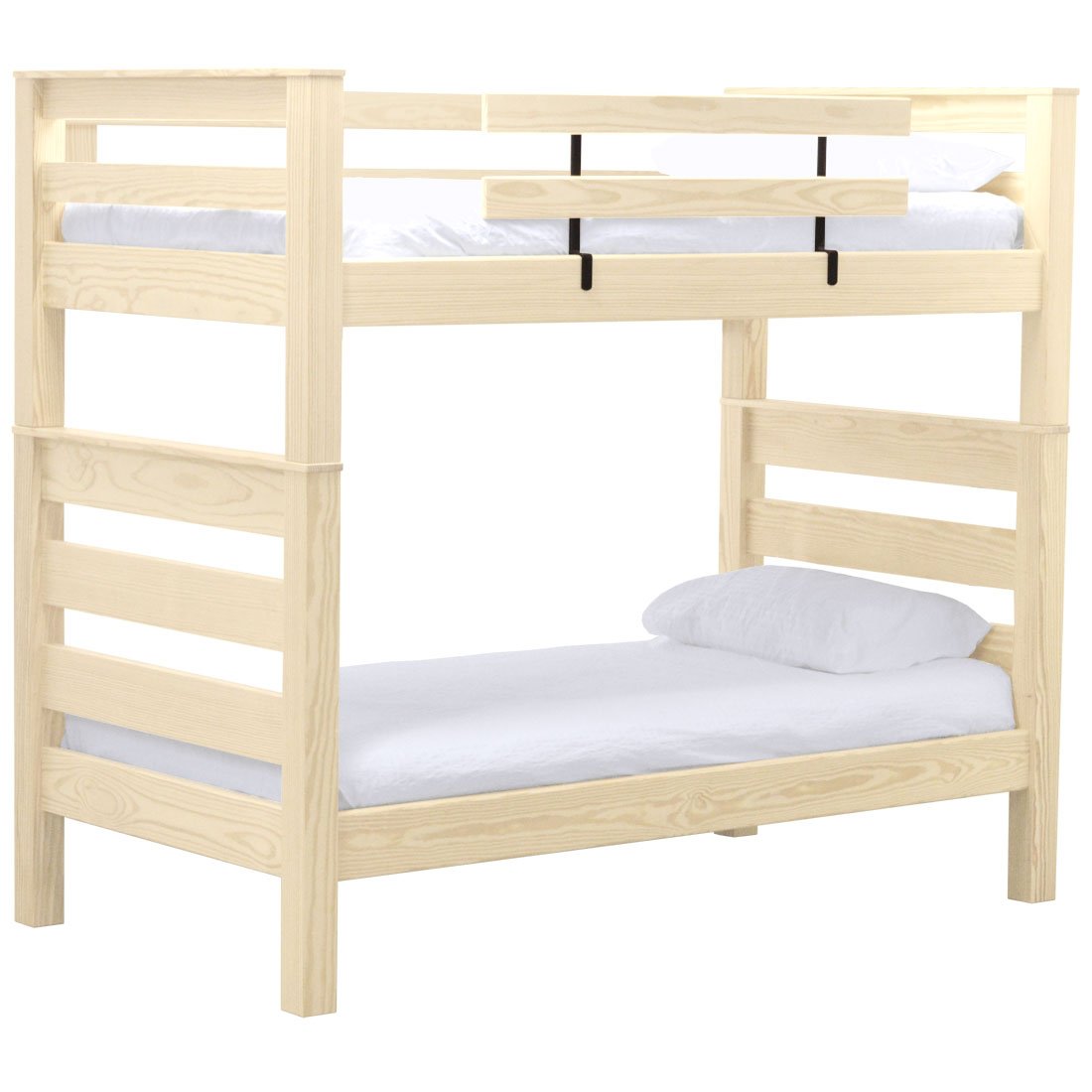 TimberFrame bunk beds feature massive corner posts with thick ladder rungs in between using mortise and tenon construction. A removable guardrail is included on the front with a full-length guardrail at the rear of the upper bed. Add optional drawers or a trundle bed for maximum use of your floor space. Ready for a mattress, no foundation required. The top of an 8” thick mattress on the lower bed will be 21” and on the upper bed will be 64” off the floor. All bunk beds and beds have been tested to accommodate over 450 pounds and are recommended for adult use.