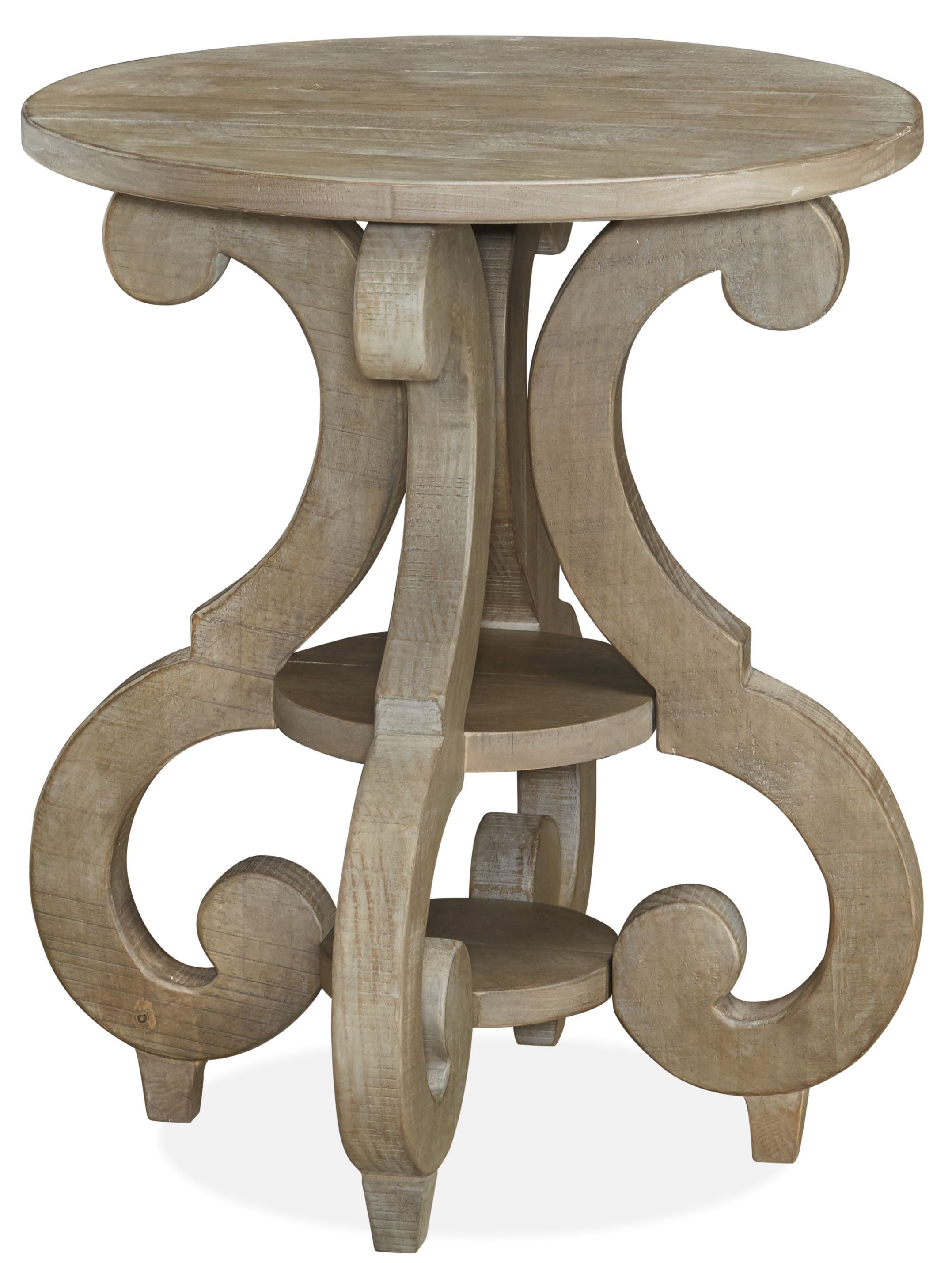 Bring Old World charm home with the Tinley Park table collection. Gracious S-curved carved bases support overlaid solid pine tops finished in vintage inspired Dovetail grey on pine.
