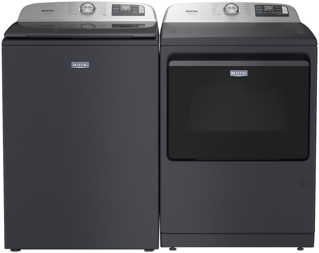 Maytag® Midnight Steel top load laundry pair with a 6 cu. ft. capacity top load washer and a 7.4 cu. ft capacity gaz dryer.Read More