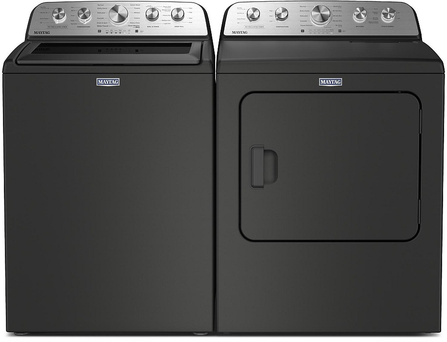 Maytag® Volcano Black Top Load Laundry Pair with a 5.5 cu. ft. capacity top load washer and a 7 cu. ft. capacity front load gas dryer.Read More