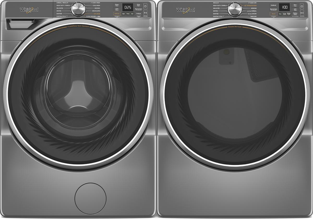Whirlpool® Core Silver front load laundry pair with a 5.8 cu. ft. capacity front load washer and a 7.4 cu. ft. capacity front load gas dryer.Read More