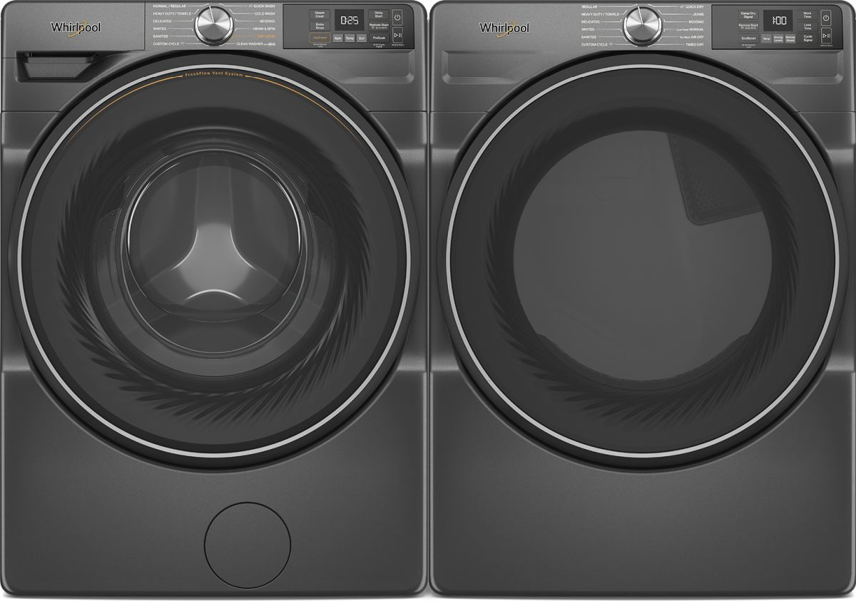 Whirlpool® Volcano Black laundry pair with a 5.2 cu. ft. capacity front load washer and a 7.4 cu. ft. capacity front load gas dryer.Read More