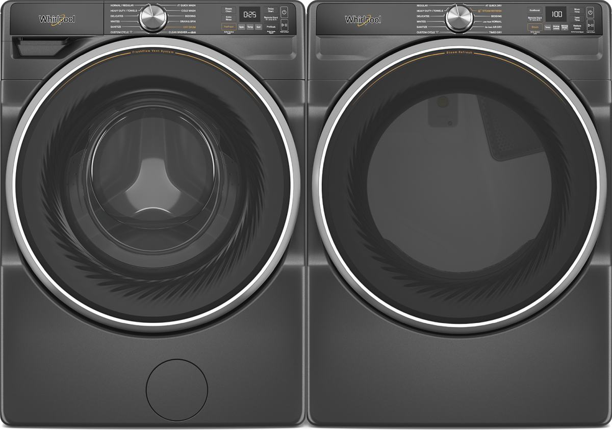 Whirlpool® Volcano Black front load laundry pair with a 5.8 cu. ft. capacity front load washer and a 7.4 cu. ft. capacity front load gas dryer.Read More