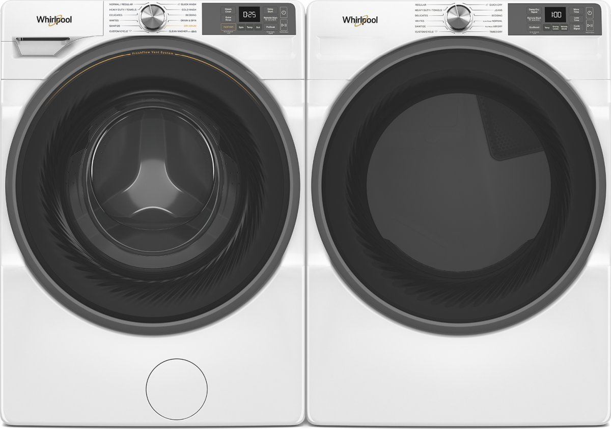 Whirlpool® White laundry pair with a 5.2 cu. ft. capacity front load washer and a 7.4 cu. ft. capacity front load gas dryer.Read More